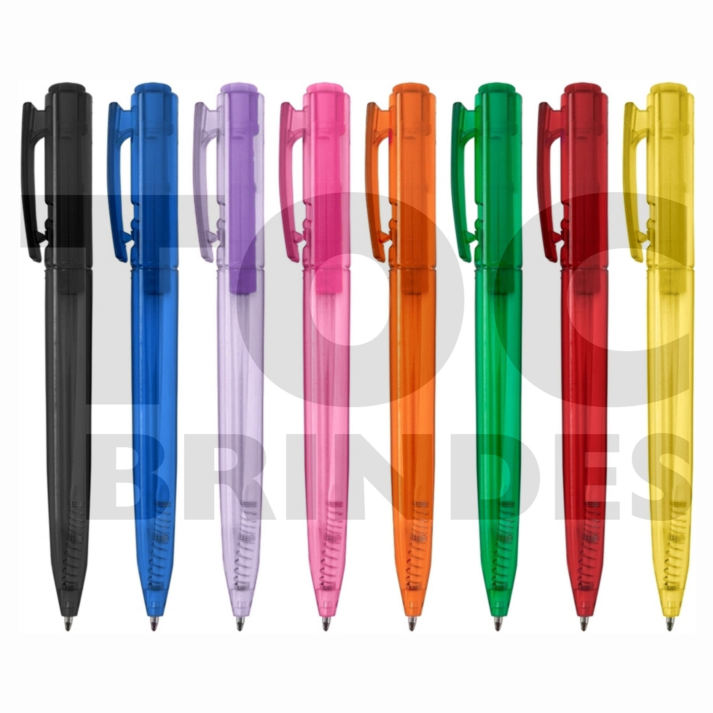 Caneta plástica com corpo inteiro colorido translúcido na mesma cor, esferográfica cor azul