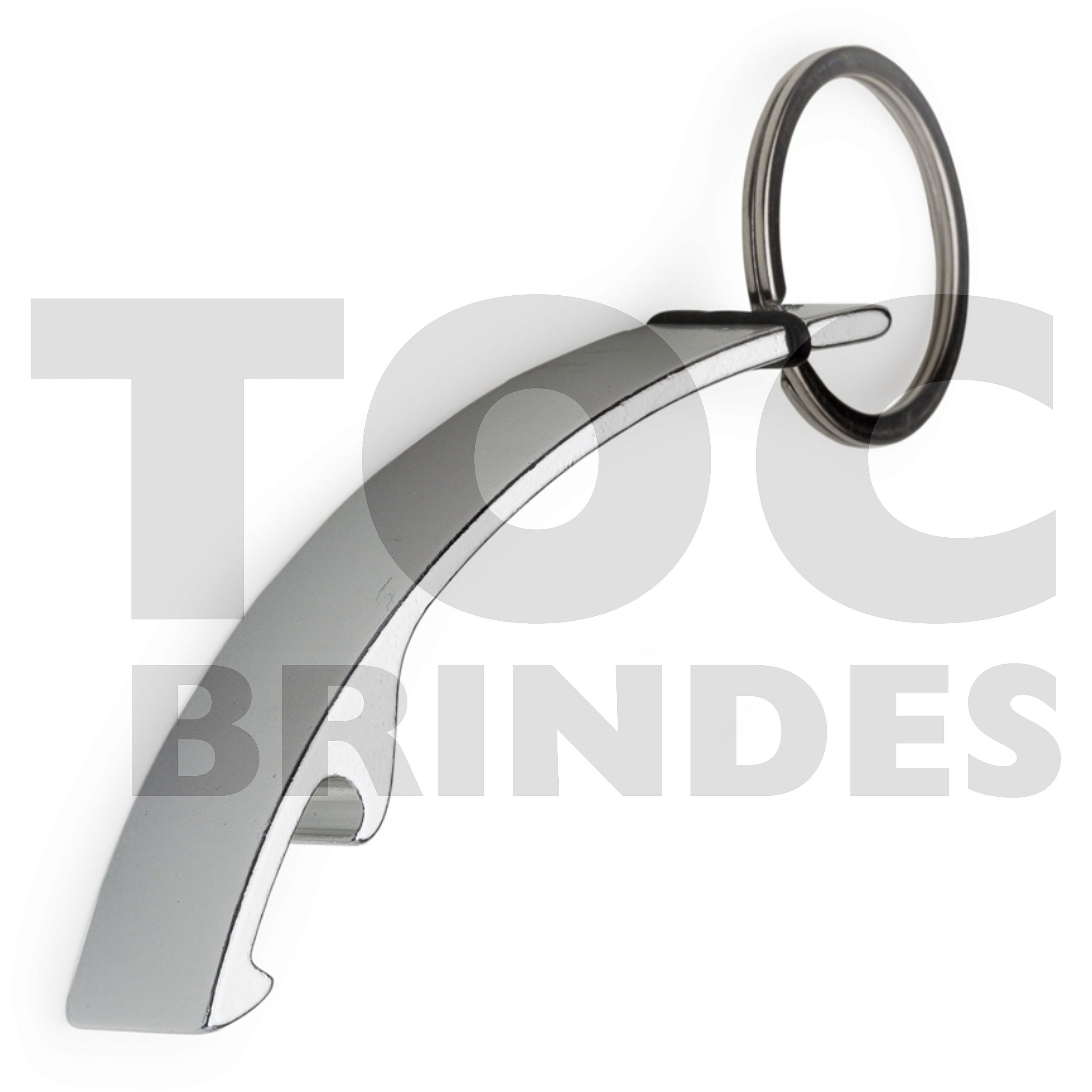 Chaveiro abridor de garrafas em aço brilhante, com anel decorativo em borracha e argola alto brilho